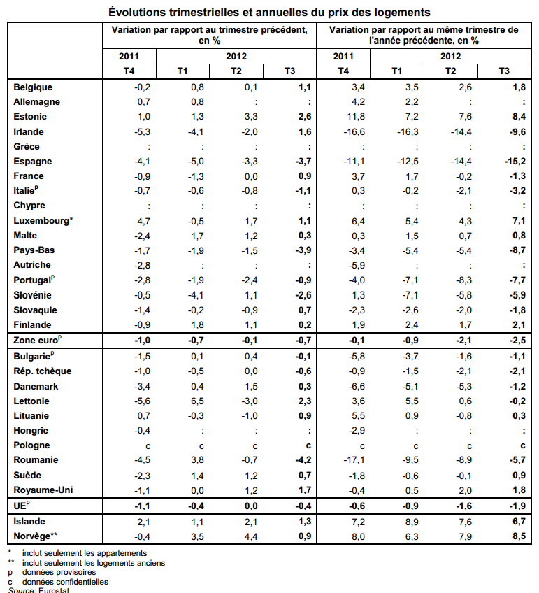 Le prix des logements, tel que mesuré par ce nouvel indice des Prix des Logement (IPL), a diminué de 2,5% dans la zone euro et de 1,9% dans l’UE au troisième trimestre 2012 comparé au même trimestre de l’année précédente.
