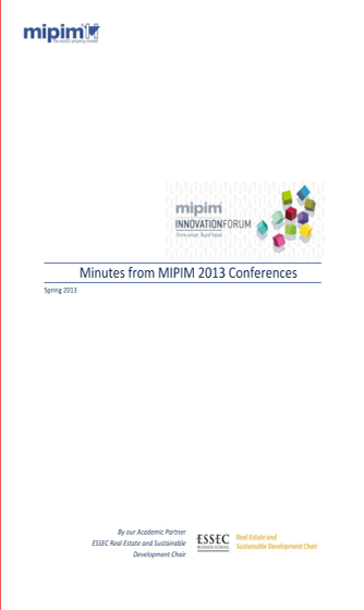 Thanks to its collaboration with MIPIM, the ESSEC Business School Real Estate and Sustainable Development Chair has produced the « Minutes from MIPIM 2013 Conferences »: summaries from a selection of MIPIM 2013 Innovation Forum conferences. Find enclosed the key contents. Minutes from MIPIM 2013 Conferences by ESSEC Le MIPIM a lancé cette année le MIPIM Innovation Forum, lieu de rencontres, d’échanges et de réflexions de tous les acteurs qui construisent la ville de demain. Ce programme exclusif du MIPIM place le bâtiment et ses utilisateurs au cœur de la réflexion et met en avant toutes les solutions innovantes afin d’optimiser la valeur de son portefeuille d’actifs. En collaboration avec le MIPIM, la Chaire Immobilier et Développement durable publie les actes des conférences du Forum dédié à l’innovation.