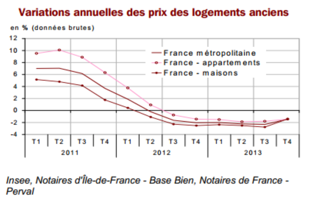 Selon l’indice Notaires-INSEE, seul indice hédonique officiel en France, les prix des logements anciens demeurent en baisse sur un an (-1,4 %) à fin 2013, aussi bien pour les maisons que pour les appartements, après deux années consécutives de baisse sensible. On note cependant que sur le 4ème trimestre 2013, et par rapport au trimestre précédent, les prix se sont stabilisés (+0,3 %), selon les données provisoires corrigées des variations saisonnières (CVS).