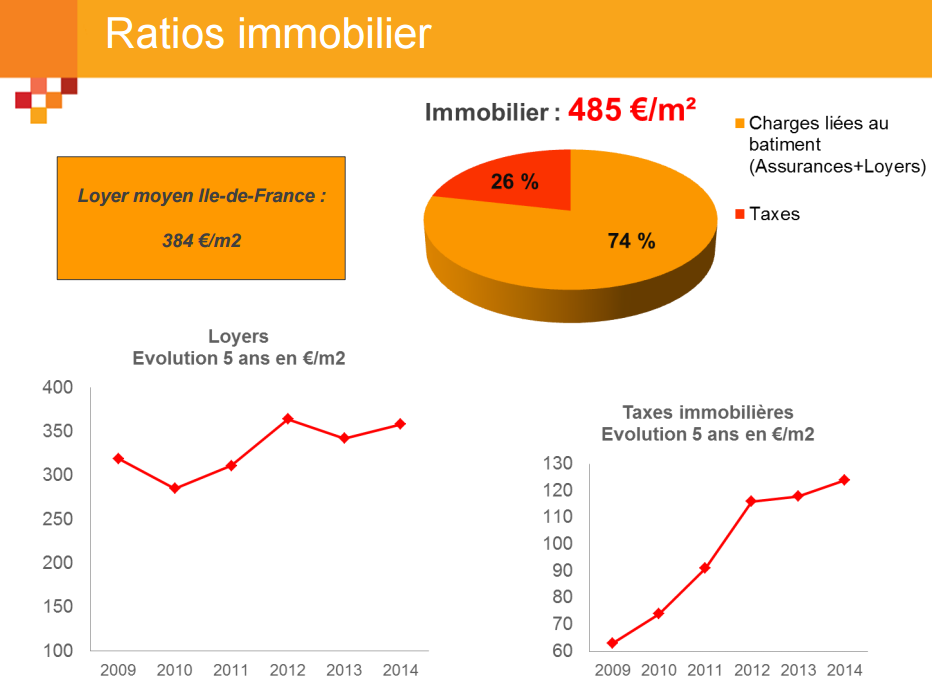 L’ARSEG note que l’immobilier représente, fiscalité comprise (14,5 %), près de la moitié du coût d’exploitation (49,5 %), qu’il soit ramené à la surface de bureaux ou au nombre de postes. Les efforts réalisés pour continuer à faire baisser certains postes de dépense comme les services ou les moyens et équipements ne parviennent pas à compenser la hausse du coût du loyer et surtout de la fiscalité.