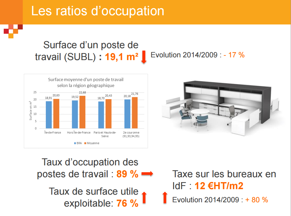- une baisse de 17 % en 5 ans de la surface moyenne allouée aux collaborateurs (en moyenne de 19,1 m² aujourd’hui)